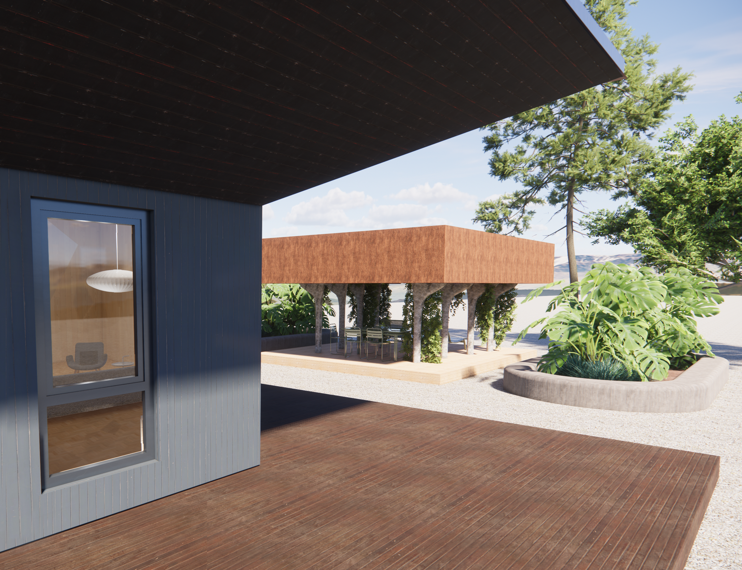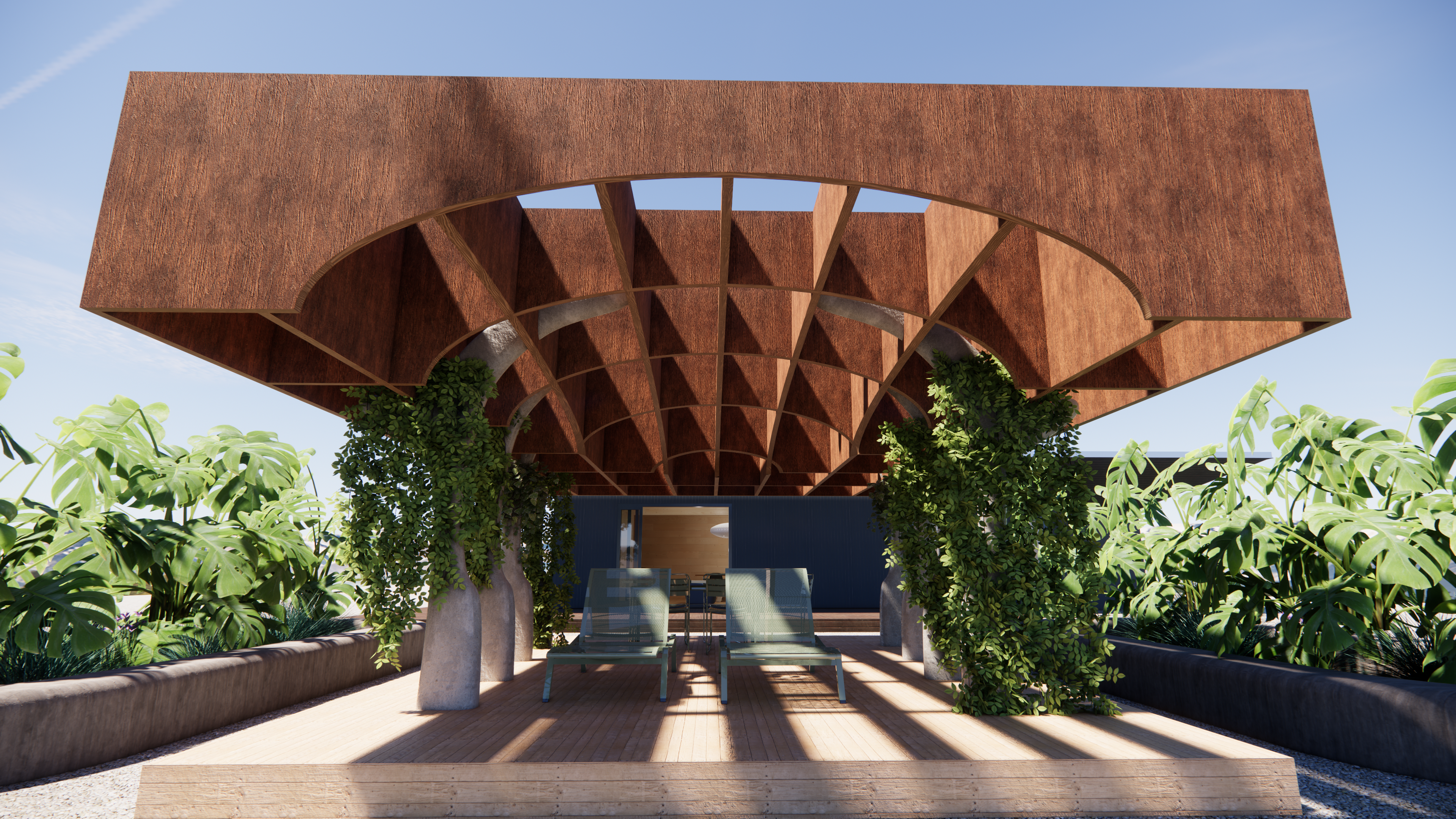 We propose an Offering. A pavilion for outdoor dining. A shade structure made of wood that is not thick enough to survive. A pavilion that is surrounded by plants. Plants that are not native or resilient enough to survive.