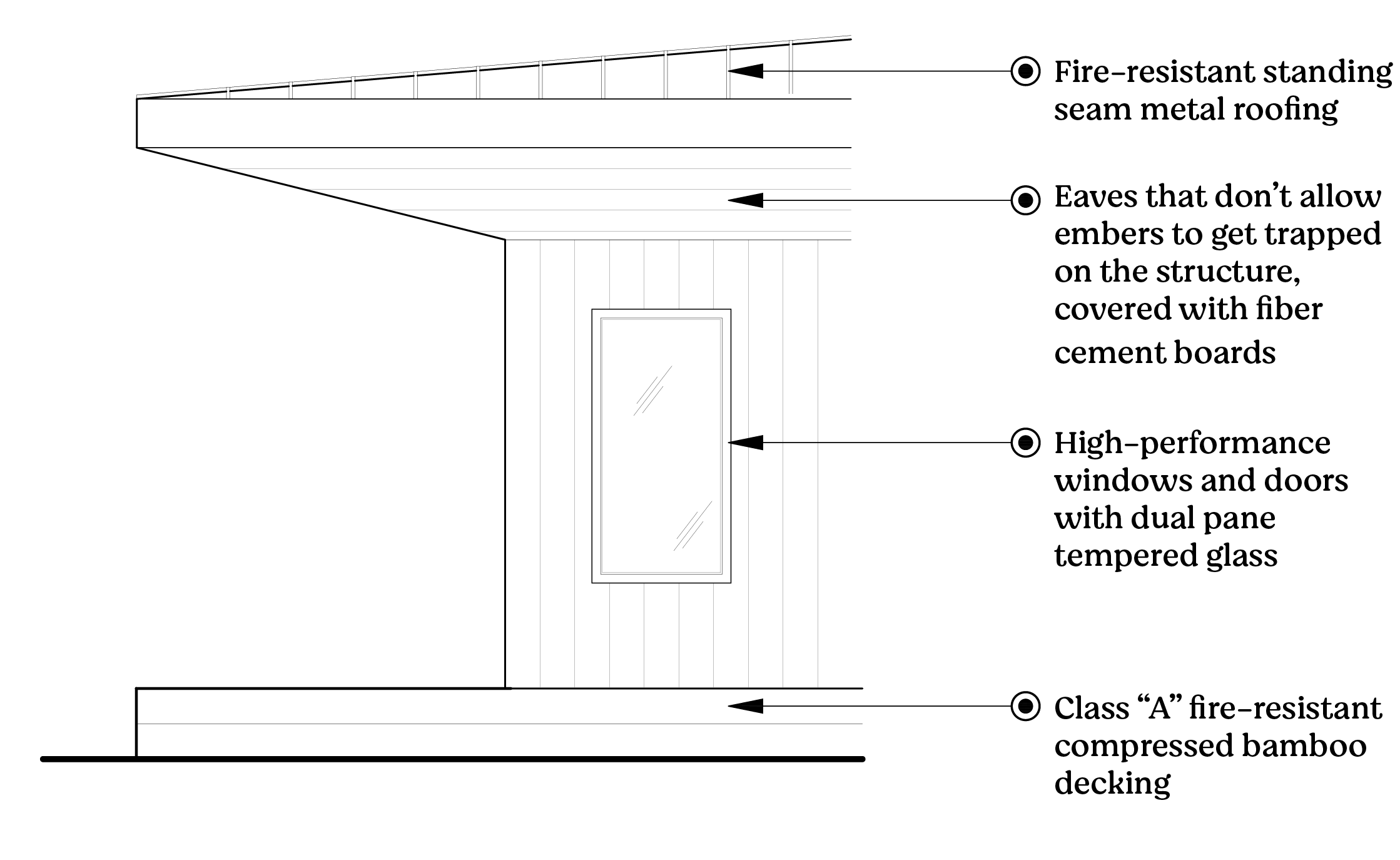 We choose to face this reality head on. Armed with research, experience and a spirit of collaboration with crafts-folk who are the best at making the components that make a house. We know that a house is only as fire safe as its weakest element. If we make a house out of concrete but use inexpensive vinyl frame windows, the house will not survive. We have a good set of tools to give a house the best chance possible in the event of a wildfire. But we also choose to acknowledge the forces we will encounter.
